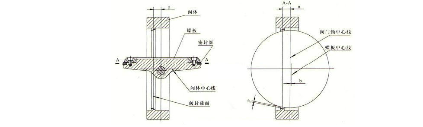 閥板回轉(zhuǎn)中心(即閥門軸中心)于閥板密封截面形成一個(gè)尺寸A偏置,并與閥體中心形成一個(gè)尺寸B偏置。