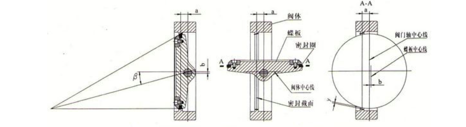 閥板回轉(zhuǎn)中心(即閥門軸中心)于閥板密封截面形成一個(gè)A偏置,并與閥體中心形成一個(gè)b偏置;閥體密封面中心線與閥座中心線(即閥體中心線)形成一個(gè)角度為β的角偏置。